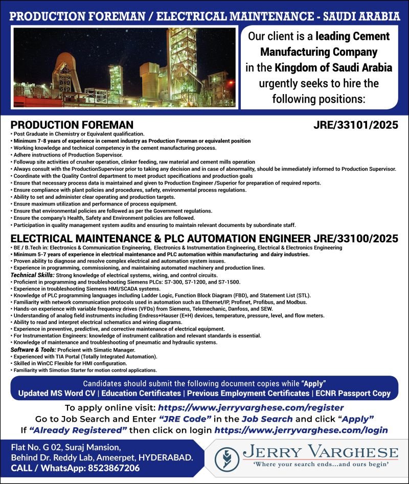 Saudi Arabia Jobs 2025: Hiring For A leading Cement Manufacturing Company