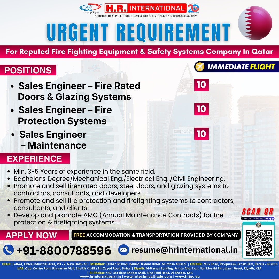 Qatar : Hiring for a reputed Fire Fighting Equipment & Safety Systems Company