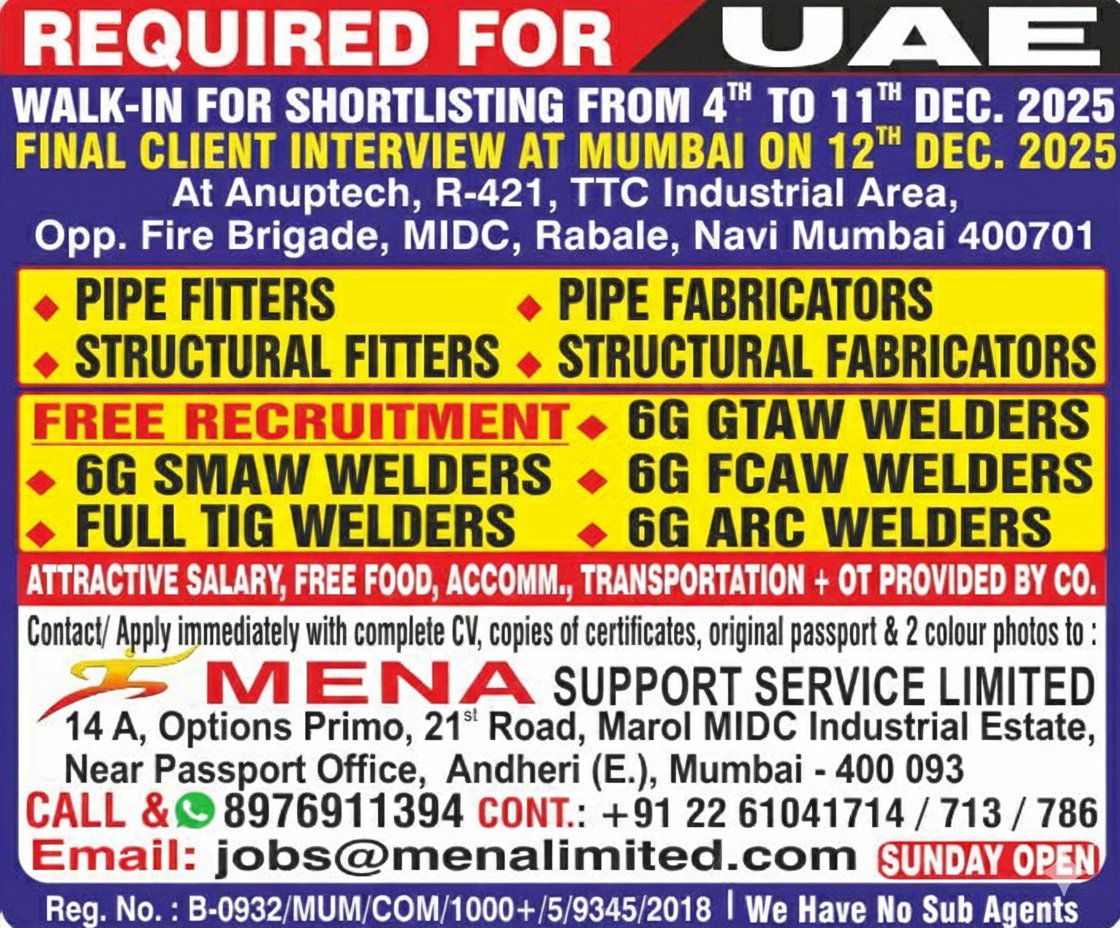 UAE Jobs 2025: Pipe Fitters, Structural Fabricators & 6G Welders – Free Food + Accommodation