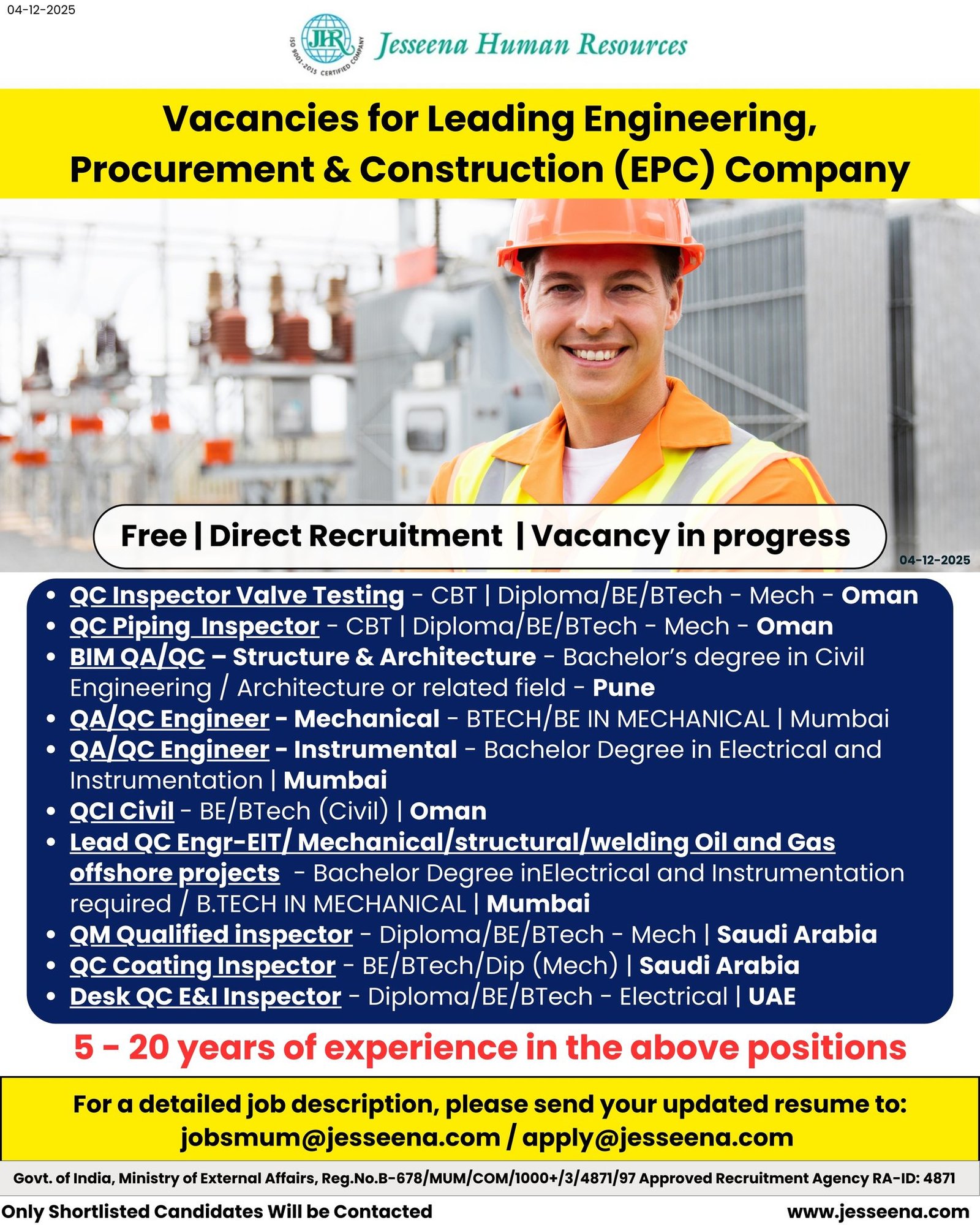 Urgent Jobs in Oman, Saudi Arabia & UAE 2025 – Leading EPC Company Hiring | Free Direct Recruitment