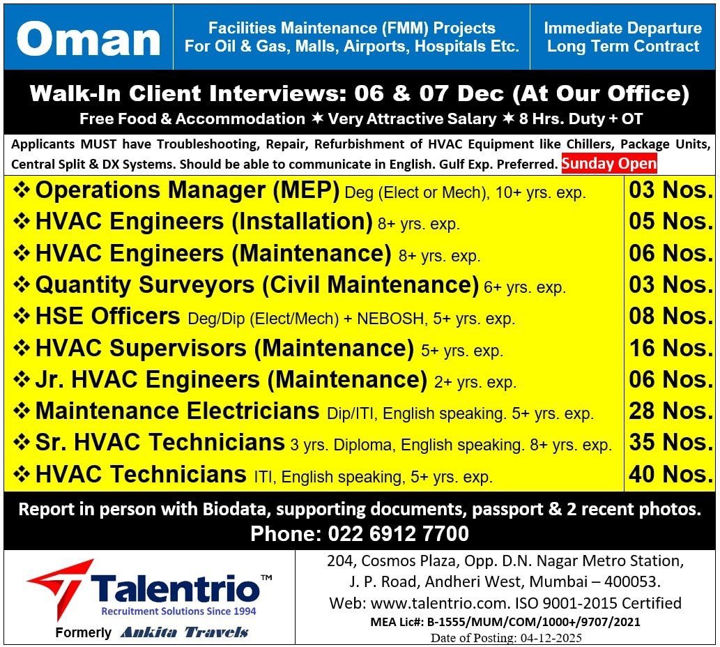 Oman – Hiring For Oil & Gas, Malls, Airports & Hospital Projects