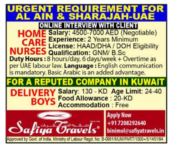 Hiring Homecare Nurses for Al Ain & Sharjah (UAE) + Delivery Boys for Kuwait