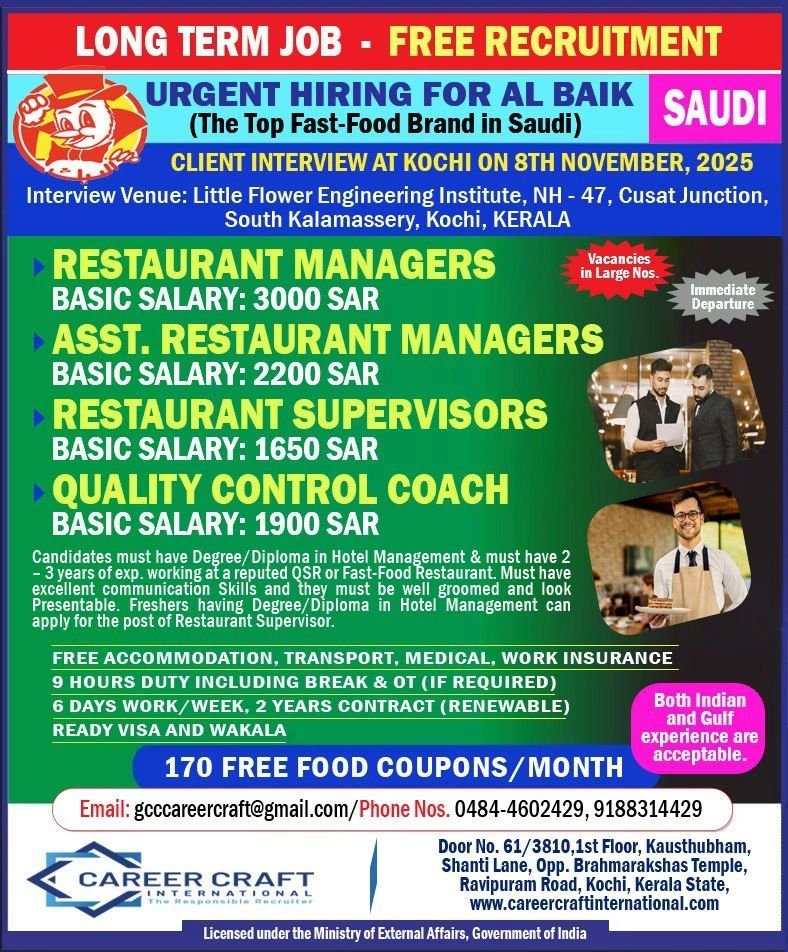 Long Term – Free Recruitment for Al Baik (Top Fast-Food Brand in Saudi)! Client Interview at Kochi on 8th November 2025. Large Nos – Immediate Departure! Degree/Diploma in Hotel Management + 2–3 yrs QSR exp. Both Indian & Gulf exp accepted.