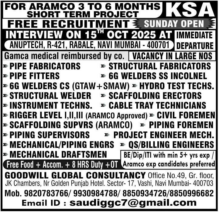 Are you seeking a short-term job opportunity with a leading company? Goodwill Global Consultancy is offering free recruitment for Aramco’s 3 to 6-month short-term project in KSA. Attend the client interview on 15th October 2025 in Navi Mumbai!