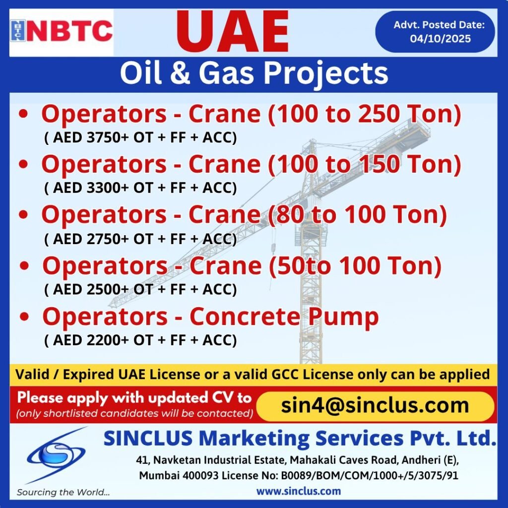 Are you a skilled professional looking for a rewarding career in the oil and gas industry? NBTC, in collaboration with Sinclus Marketing Services Pvt. Ltd., is hiring for various positions in UAE oil and gas projects. Apply now and take the next step in your career!