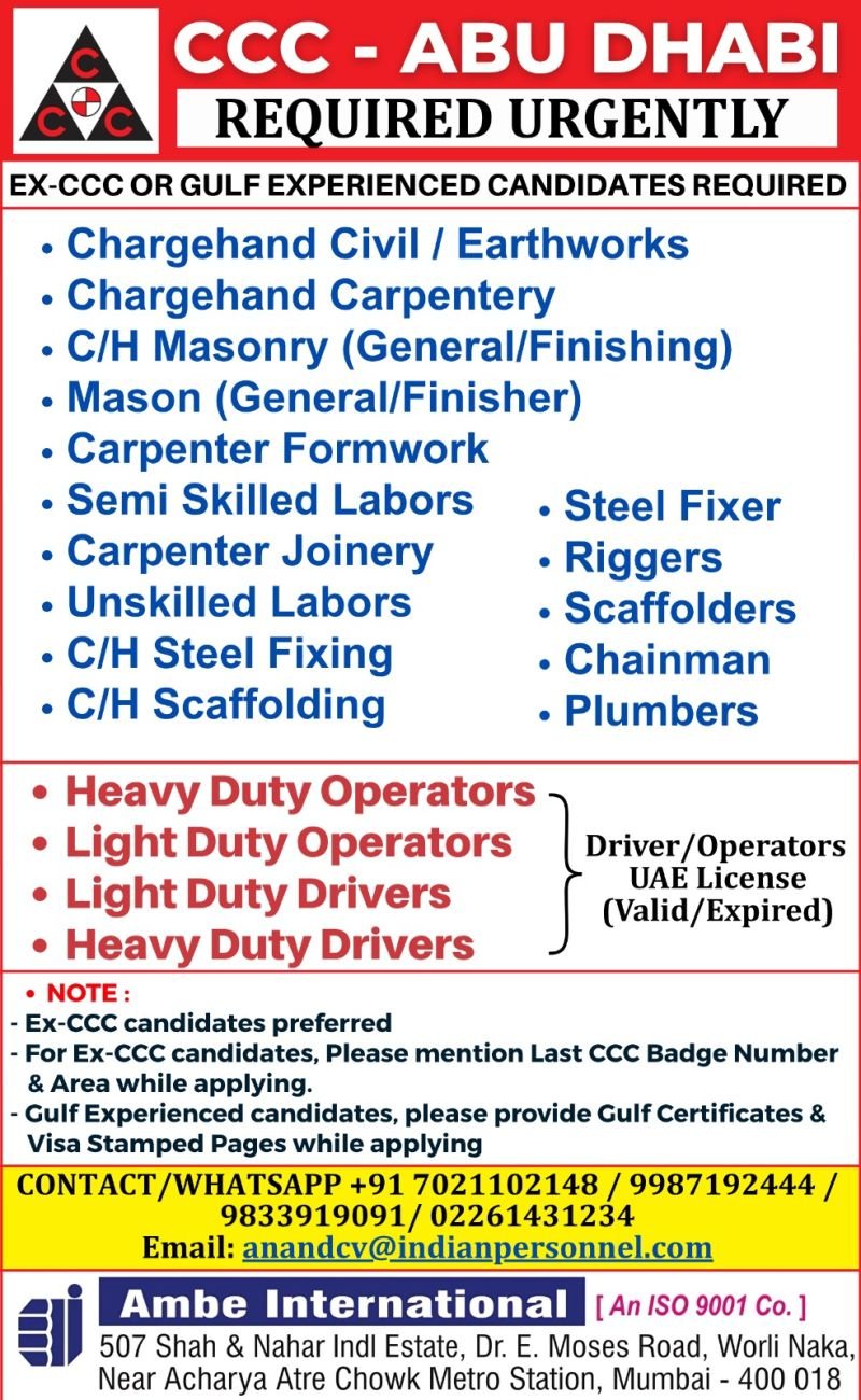 Looking for urgent job opportunities in Abu Dhabi? Ambe International is seeking ex-CCC or Gulf-experienced candidates for various roles with China Construction Company (CCC). Apply now for long-term positions in civil, earthworks, and heavy machinery operations.