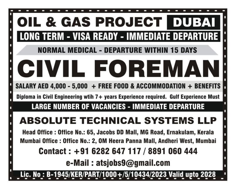 Absolute Technical Systems LLP is hiring for Civil Foreman positions for a long-term oil & gas project in Dubai. With visa-ready status and immediate departure within 15 days, this is an urgent opportunity for experienced professionals. Apply now!