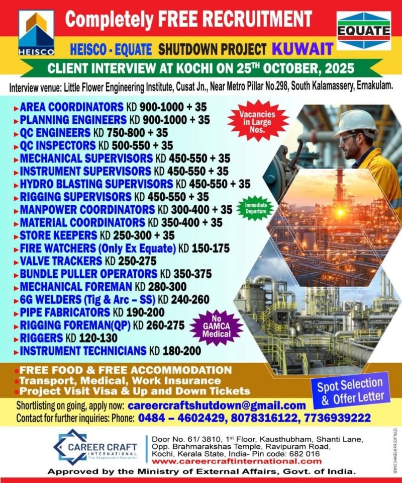 Seize the opportunity to work on the HEISCO-Equate Shutdown Project in Kuwait with completely free recruitment. A client interview is scheduled for 25th October 2025 at Kochi. This is your chance to join a prestigious project with attractive salaries, free benefits, and immediate departure options.