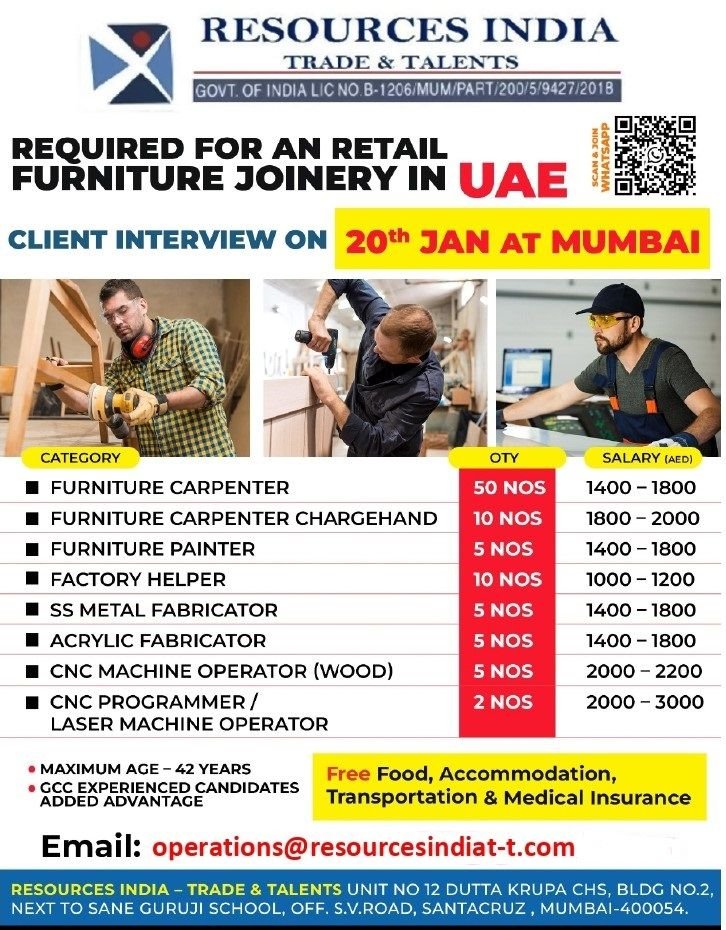UAE: Recruitment For A leading retail furniture joinery company
