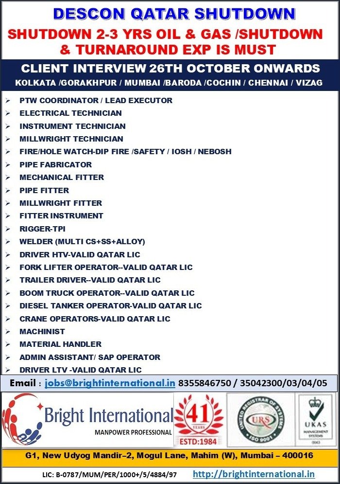 Bright International is thrilled to announce urgent hiring for Descon Qatar Shutdown roles. Candidates with 2-3 years of oil & gas/shutdown & turnaround experience are a must. Client interviews start 26th October 2025 onwards across multiple locations.