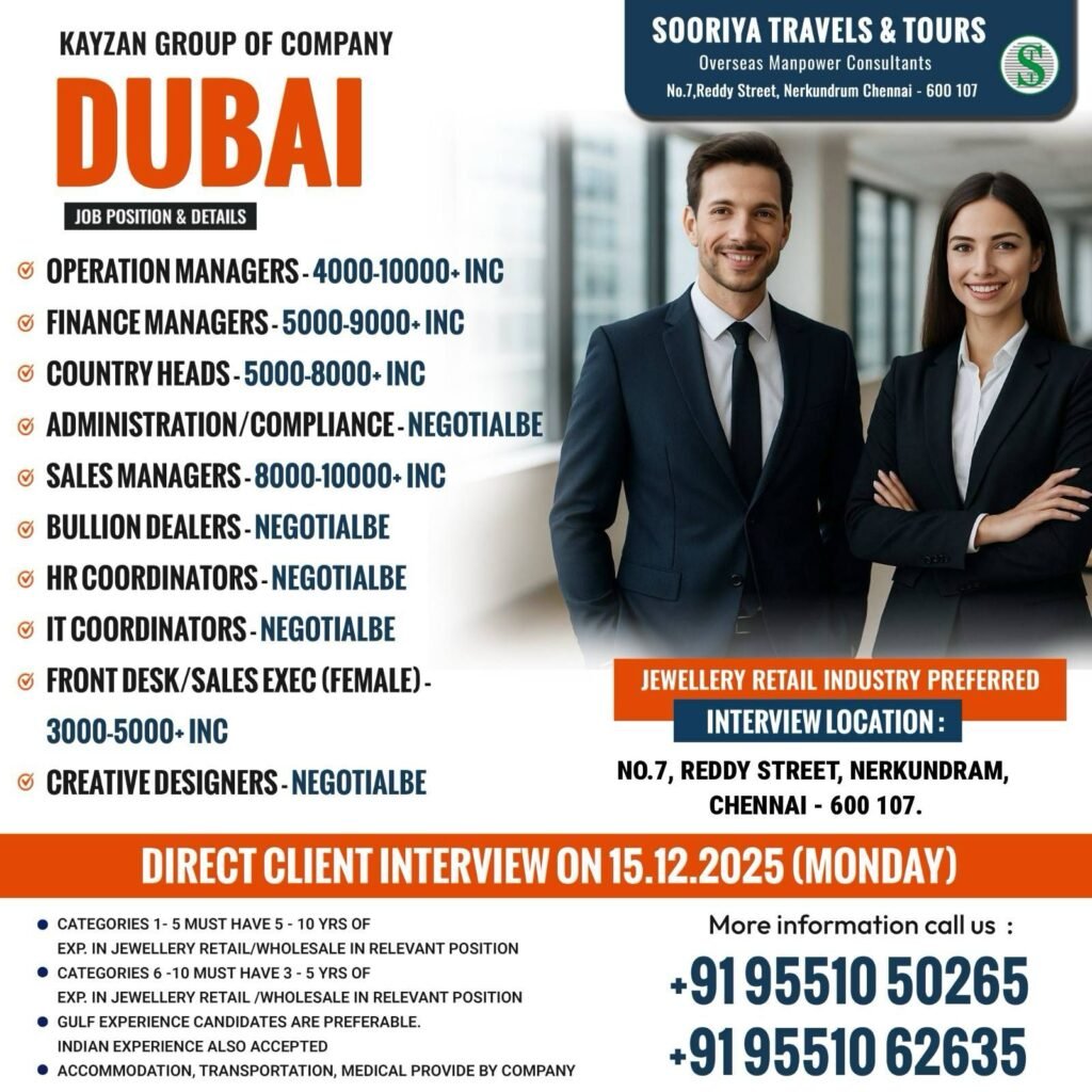 Kayzan Group of Company is urgently hiring for multiple positions in Dubai. Direct client interview on 15th December 2025 (Monday) in Trichy. Jewellery retail/wholesale experience preferred (1–3 years). Gulf experienced candidates preferred, but Indian experience also accepted.