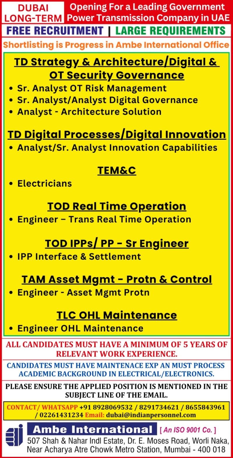 Free Recruitment – Shortlisting in Progress! Ambe International (ISO 9001 Co.) is hiring for a leading Government Power Transmission Company in Dubai, UAE. Large number of vacancies – Excellent salary + benefits. All candidates must have minimum 5 years relevant experience.