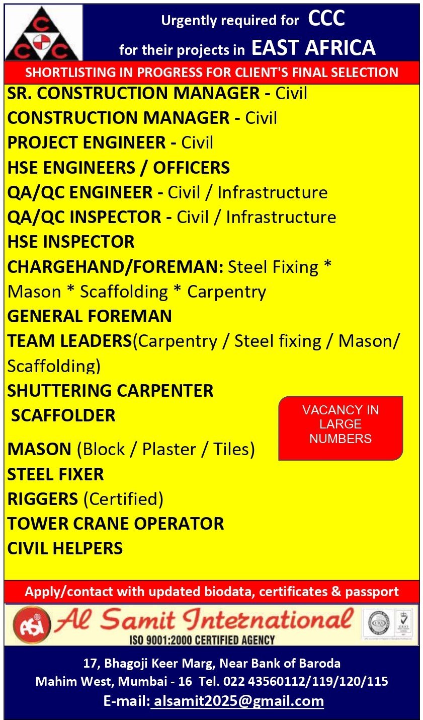 Are you a skilled professional looking for urgent opportunities in East Africa? Al Samit International is recruiting for CCC projects with shortlisting in progress for client final selection. Apply now with your updated biodata and certificates!