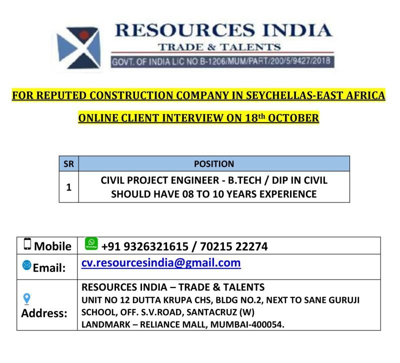 Hiring Civil Project Engineer for Seychelles-East Africa