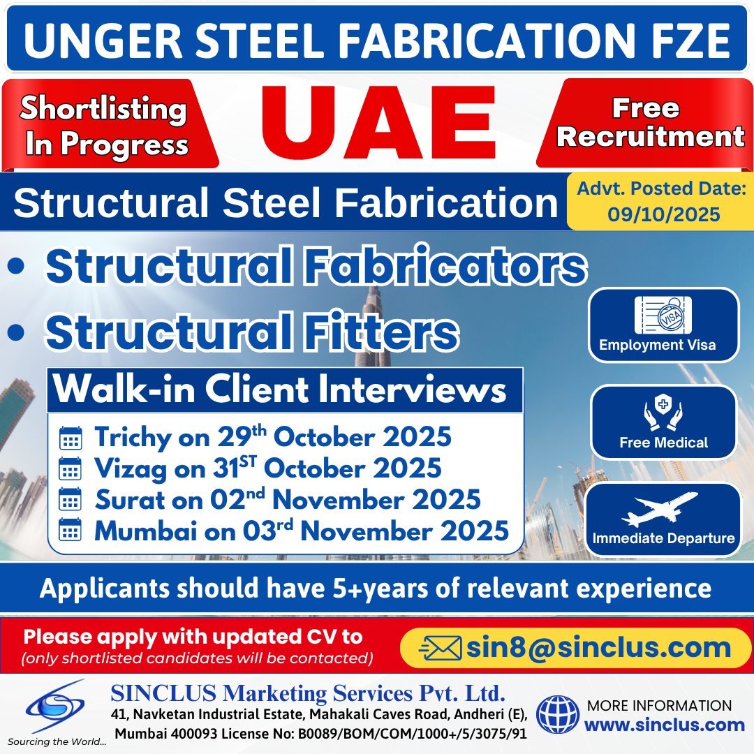 Urgently Required for Unger Steel Fabrication FZE, UAE 2025
