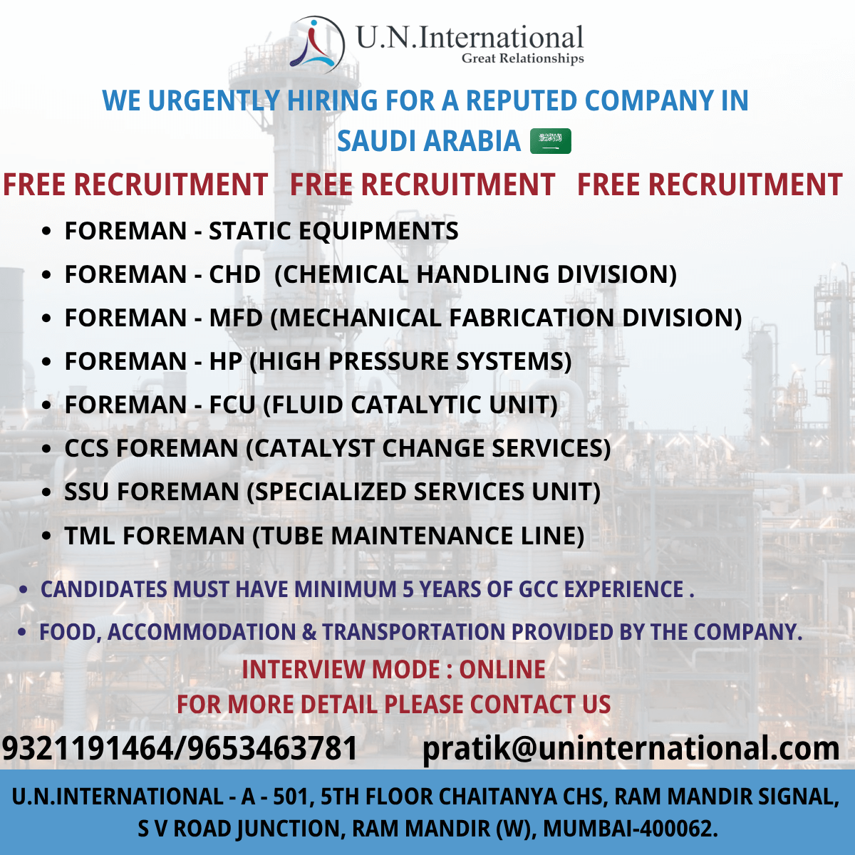 Urgent Hiring for a Reputed Company in Saudi Arabia