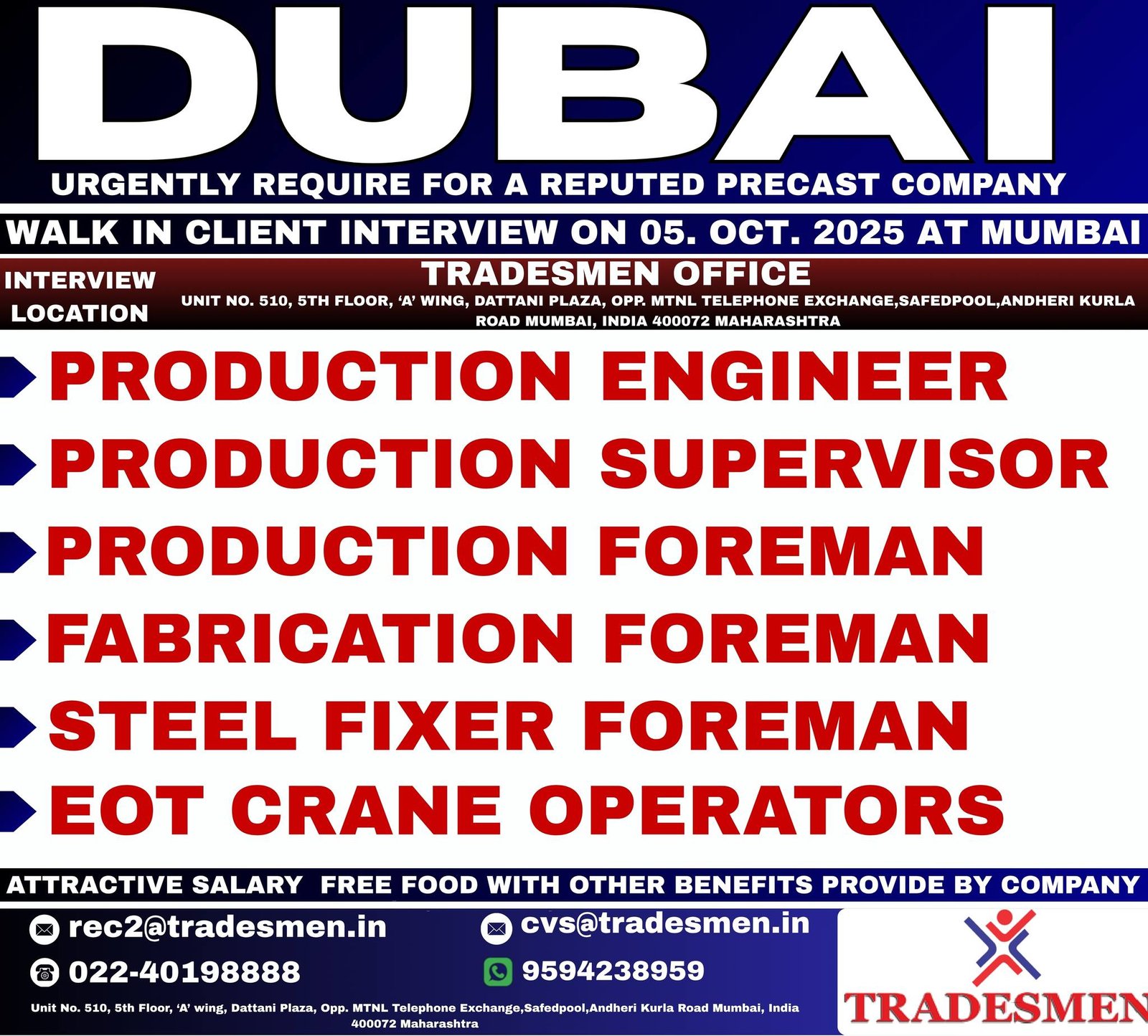 UAE – Urgent Job Openings for Reputed Precast Company in Dubai