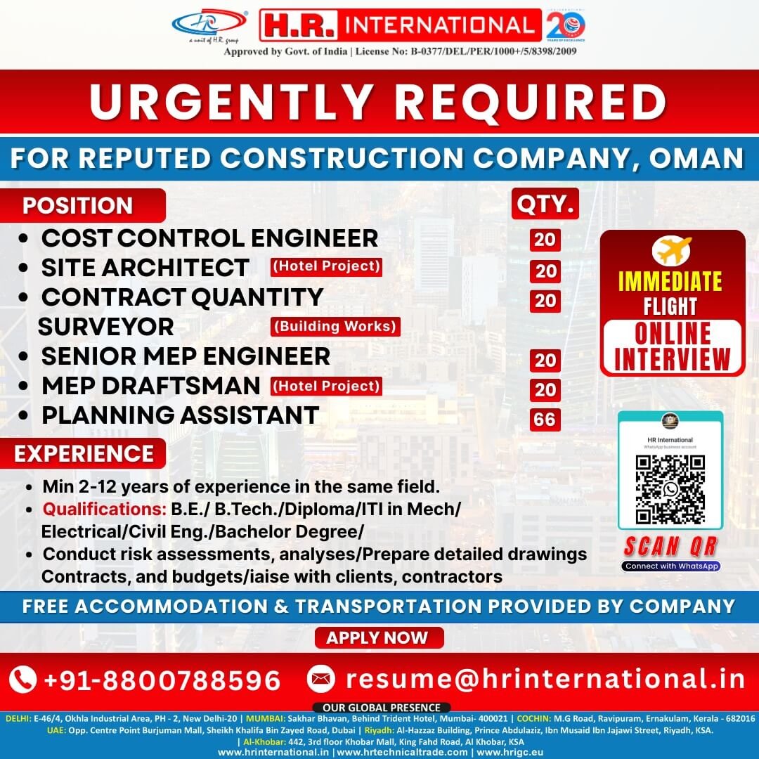 Urgent Job Openings at Reputed Construction Company in Oman