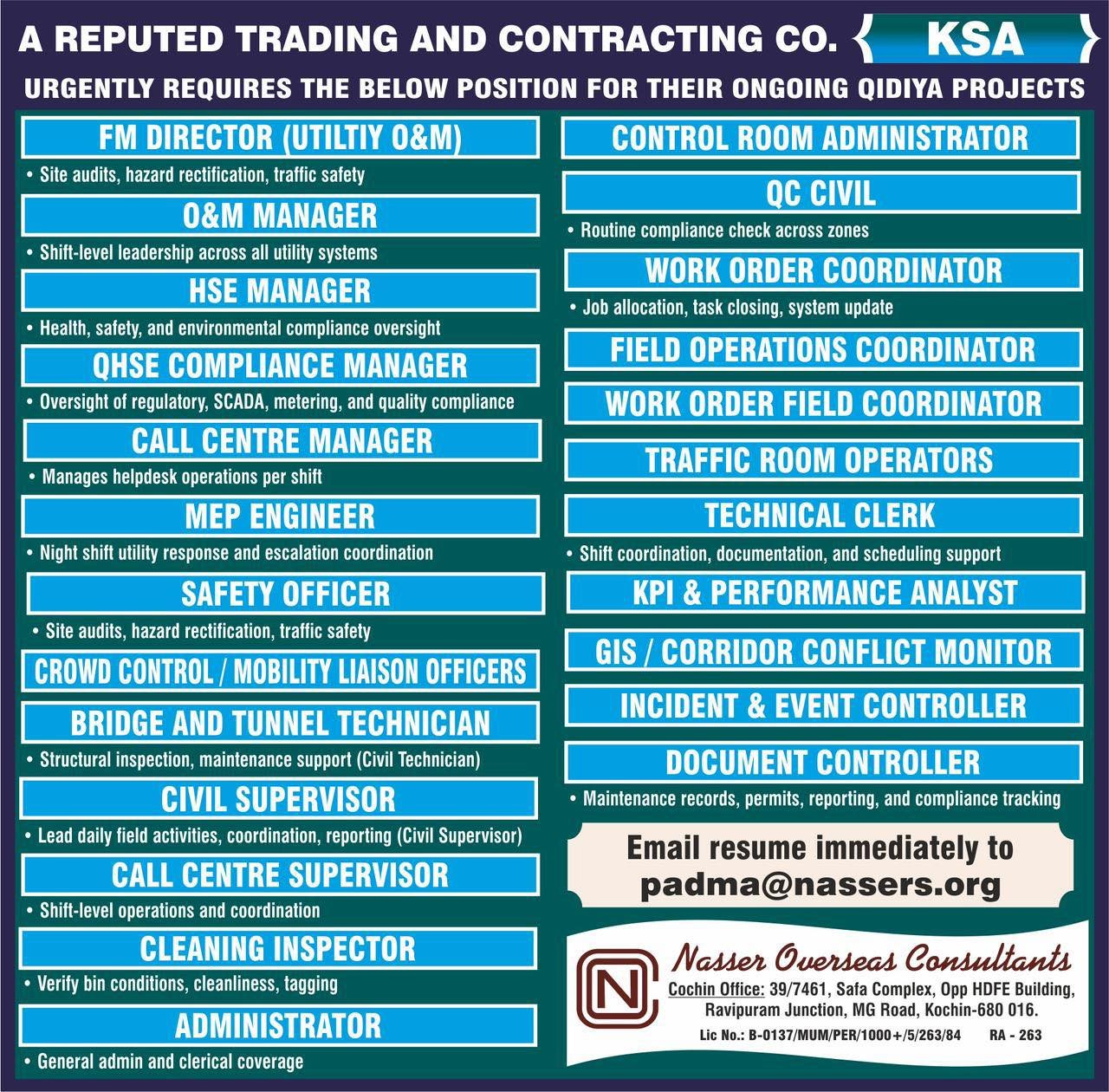 Urgent Job Openings in Saudi Arabia with a Reputed Trading and Contracting Company