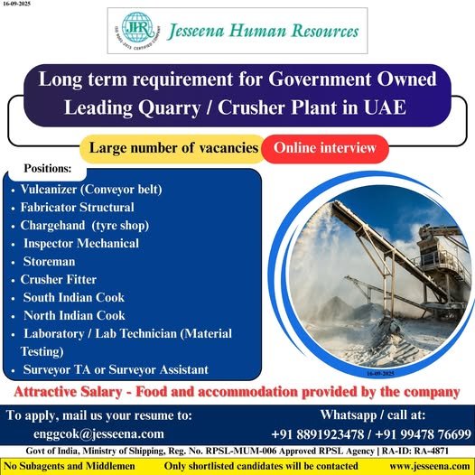 UAE Jobs – Long term requirement for Government Owned Leading Quarry / Crusher Plant