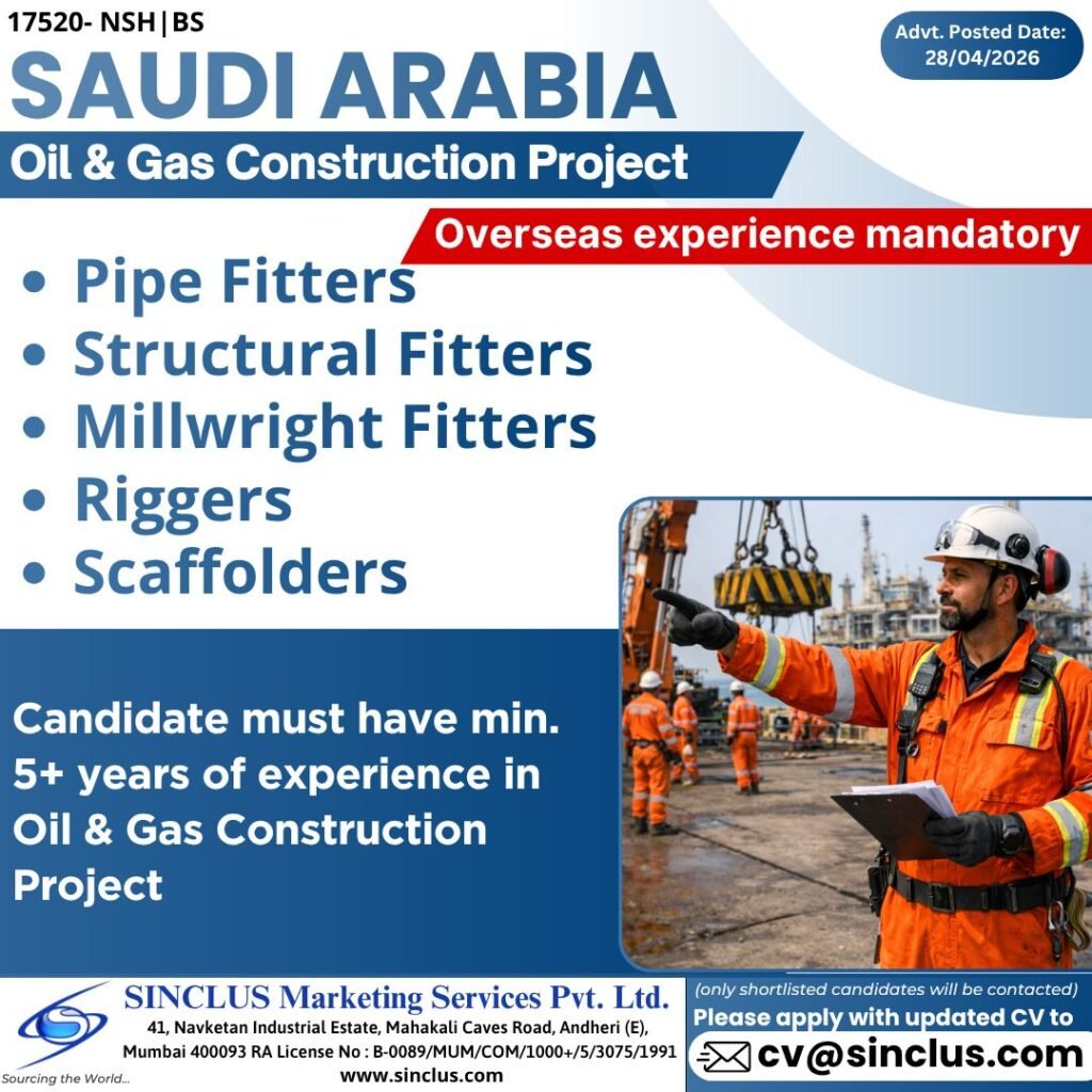 We are hiring experienced professionals for a leading Oil & Gas Construction Project in Saudi Arabia.