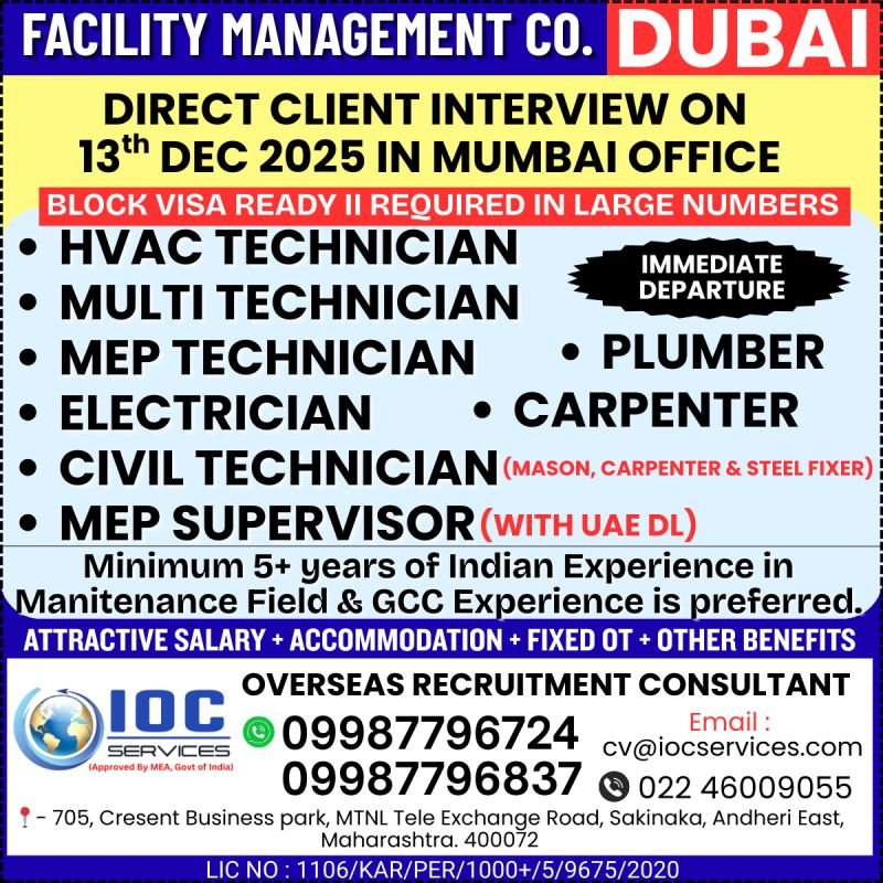 Urgent Dubai Facility Management Jobs – Direct Client Interview Mumbai 13th Dec 2025
