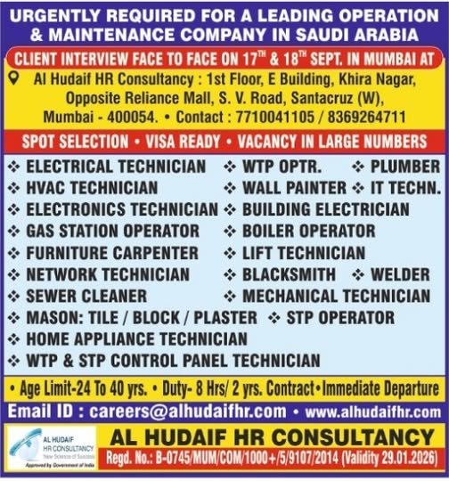 Jobs in Saudi Arabia – Urgently required for O&M Company