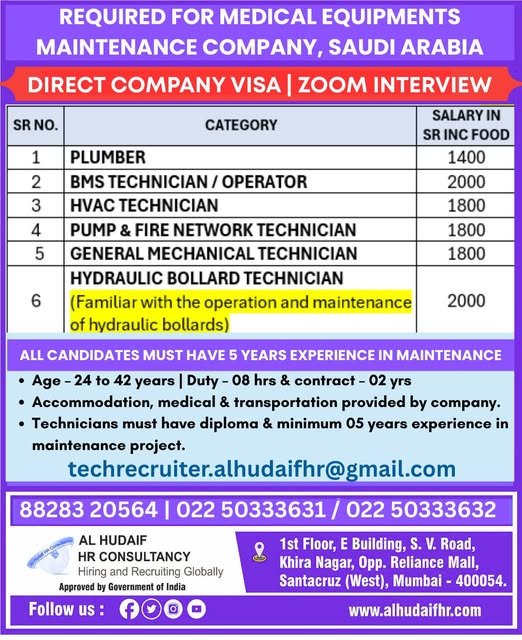 Hiring for a Leading Maintenance Company in Saudi Arabia