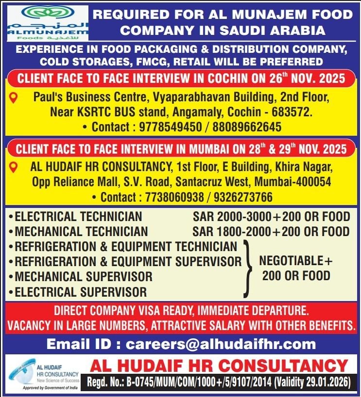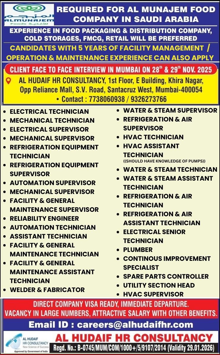 Urgent Recruitment For Al Munajem Food Company Saudi Arabia