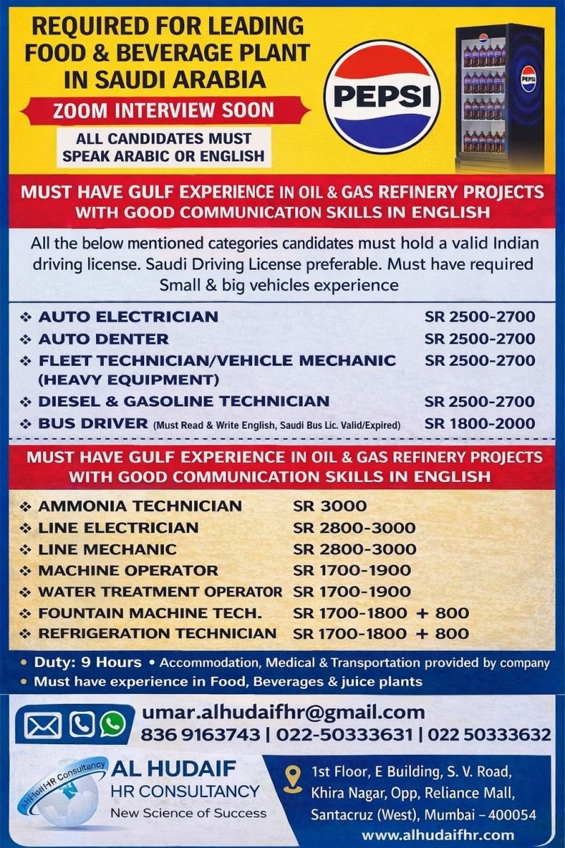 Saudi Arabia Jobs 2026: Leading Food & Beverage Plant Hiring Skilled Technicians & Drivers – Zoom Interviews Coming Soon!