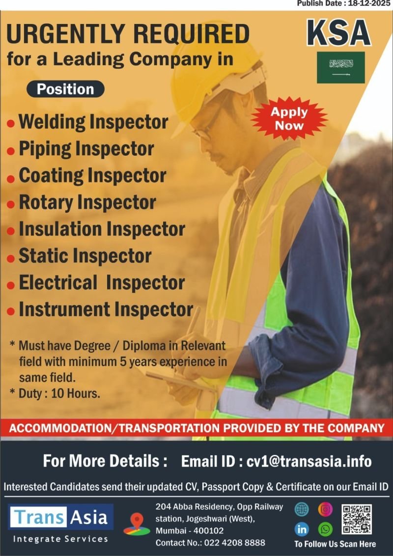 All Candidates having Overseas Experience with Certificates / Qualification cards need to apply / report with CV’s Credentials Original Passport & Photos: