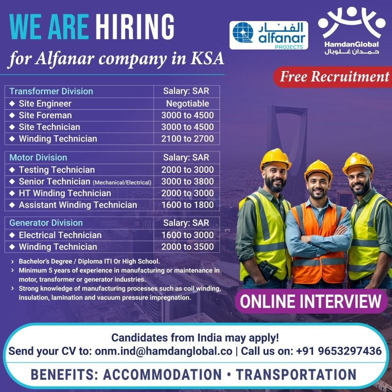 Free Recruitment for Alfanar company in Saudi Arabia – Online Interview