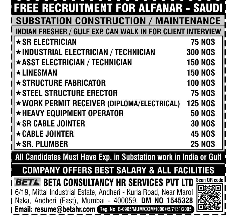 Walk-in to our MUMBAI office for shortlisting and scheduling interview OR send biodata and document copies to Email: resume@betahr.com