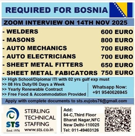 FREE RECRUITMENT for Bosnia & Herzegovina! A reputed European construction & manufacturing company is hiring skilled tradesmen with Gulf experience. Zoom client interview on 14th November 2025. High salary up to 800 EURO, 08 hours duty / 06 days a week, yearly renewable contract, free food & accommodation. Apply now – limited seats!