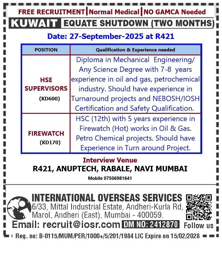 International Overseas Services is offering free recruitment for the Equate Shutdown Project in Kuwait (two months). Attend the interview on 27-September-2025!