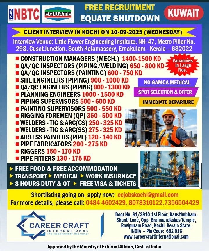Career Craft International, an approved recruiter by the Ministry of External Affairs, Govt. of India, is conducting free recruitment for the Equate Shutdown in Kuwait. A client interview is scheduled for Wednesday, September 10, 2025.