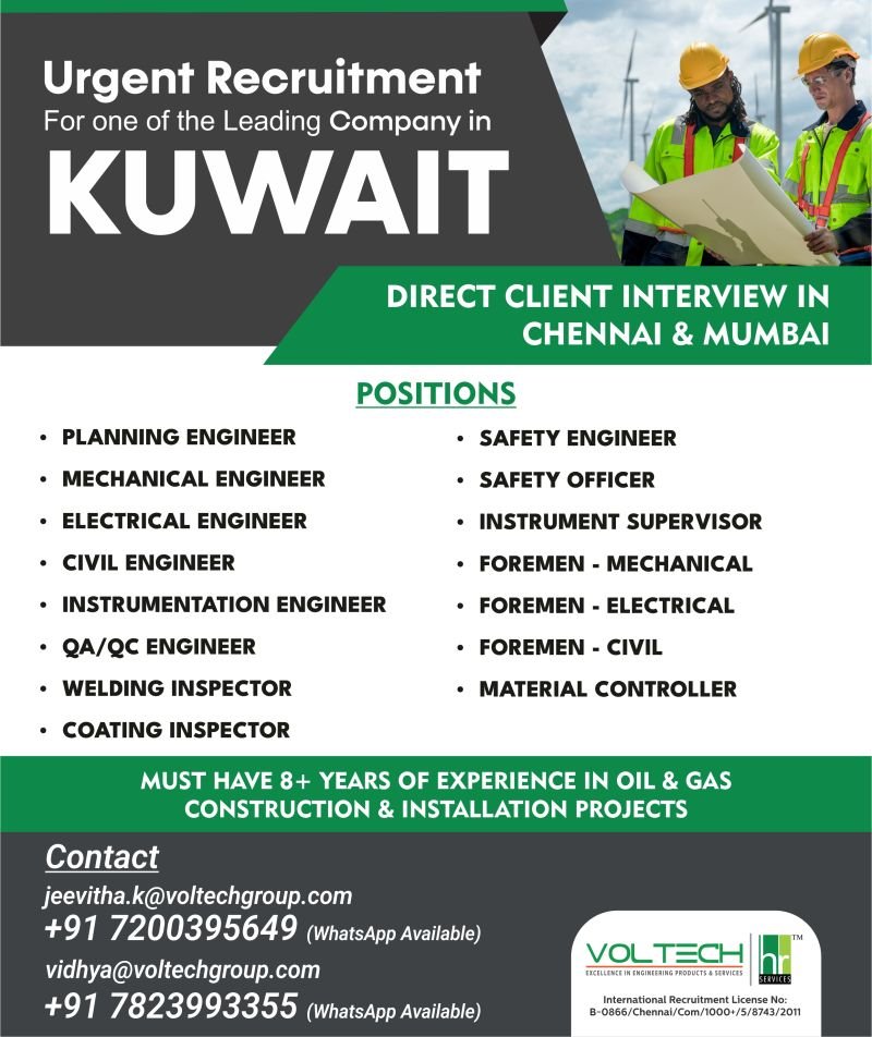 A leading Oil & Gas firm in Kuwait is in an urgent race to fill over a dozen critical technical roles. If you have 8+ years of experience on construction and installation projects, you cannot afford to miss this!