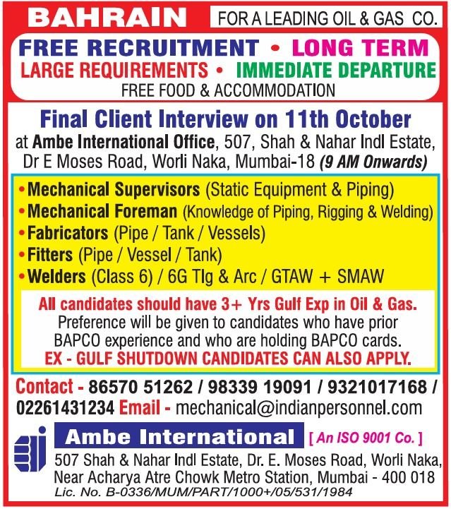 Looking for long-term career opportunities in the oil and gas industry? Ambe International, an ISO 9001 certified company, is offering free recruitment with immediate departure for a leading oil & gas company in Bahrain. Final client interviews are scheduled for 11th October!