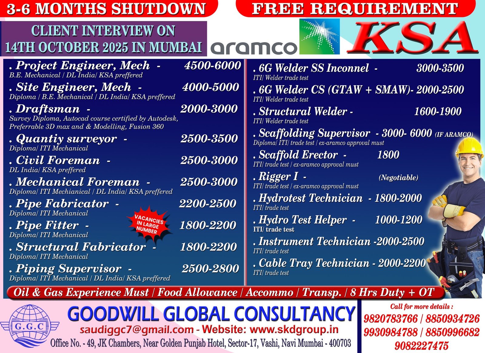 Looking for a career opportunity in Saudi Arabia? Goodwill Global Consultancy is conducting a client interview on October 14th, 2025, in Mumbai for a 3-6 month shutdown project with Aramco. Apply now for free recruitment!