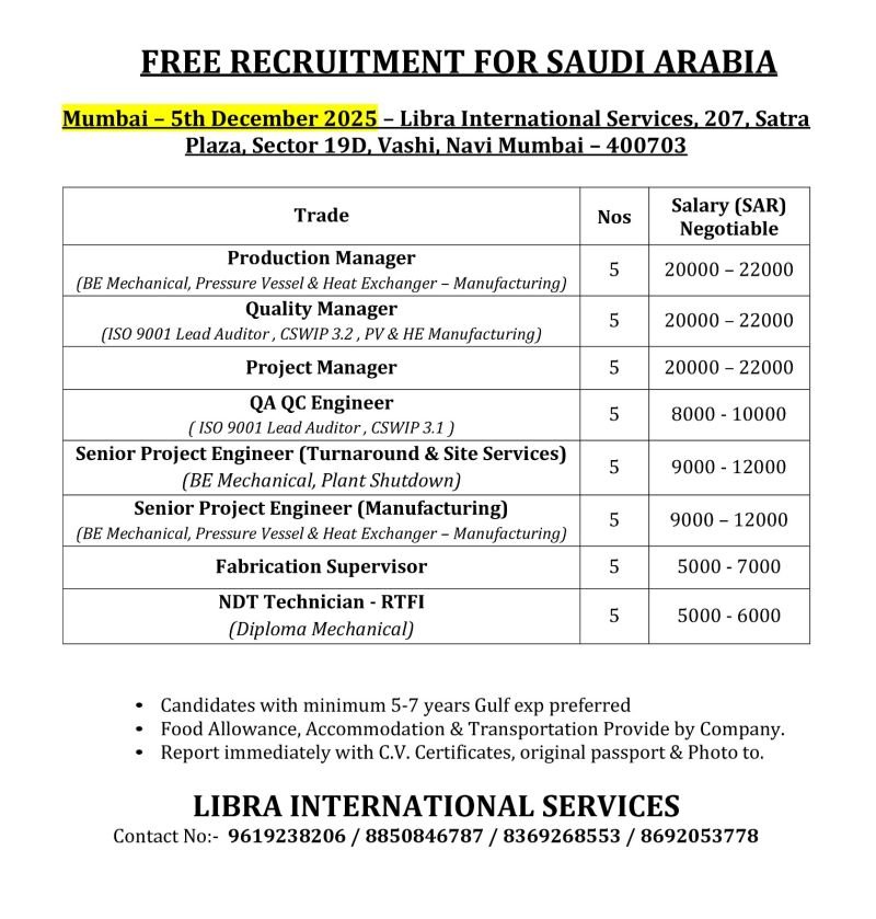 A leading Saudi Arabian company specializing in Pressure Vessels, Heat Exchangers, and Plant Shutdown/Turnaround services has announced FREE RECRUITMENT for experienced professionals. Client interview is scheduled in Mumbai on 5th December 2025.