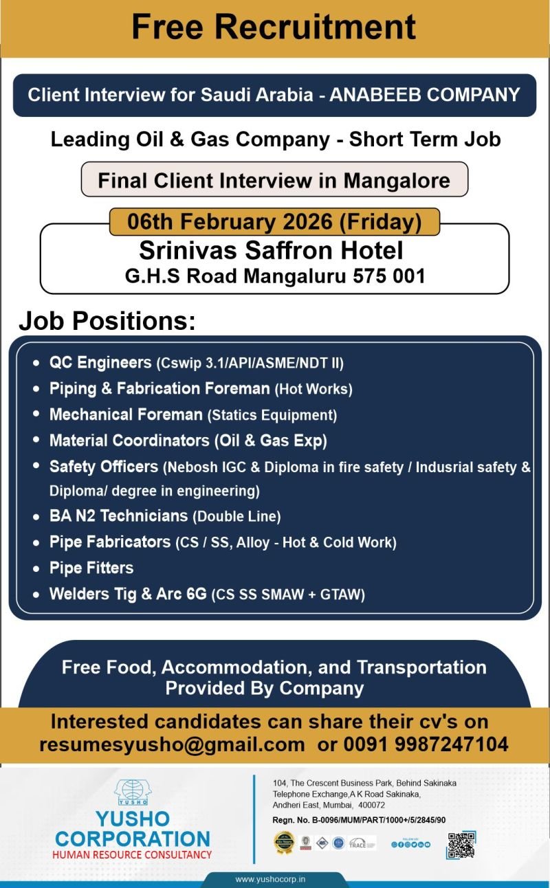A leading Oil & Gas company in Saudi Arabia (ANABEEB Company) has announced free recruitment for short-term Oil & Gas jobs. The recruitment process includes a final client interview in Mangalore on 06 February 2026 (Friday).