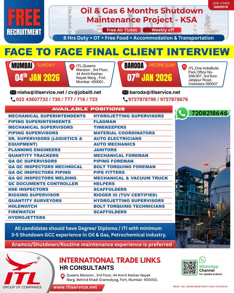 Free Recruitment For Saudi Arabia – Oil & Gas Shutdown Project