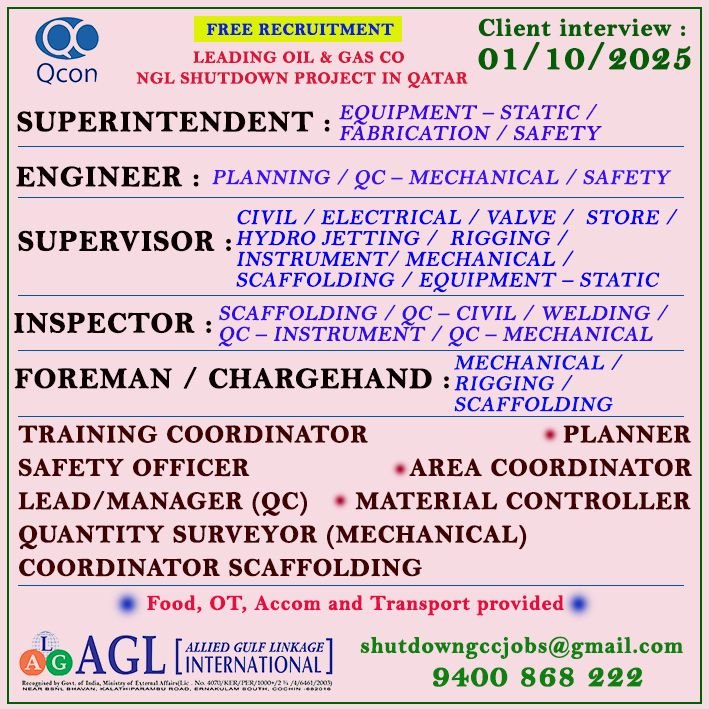 Looking for a career in the oil and gas industry? Allied Gulf Linkage is conducting a free recruitment drive for the NGL Shutdown Project in Qatar. The client interview is scheduled for 01/10/2025. With attractive benefits, this is your chance to join a leading company!