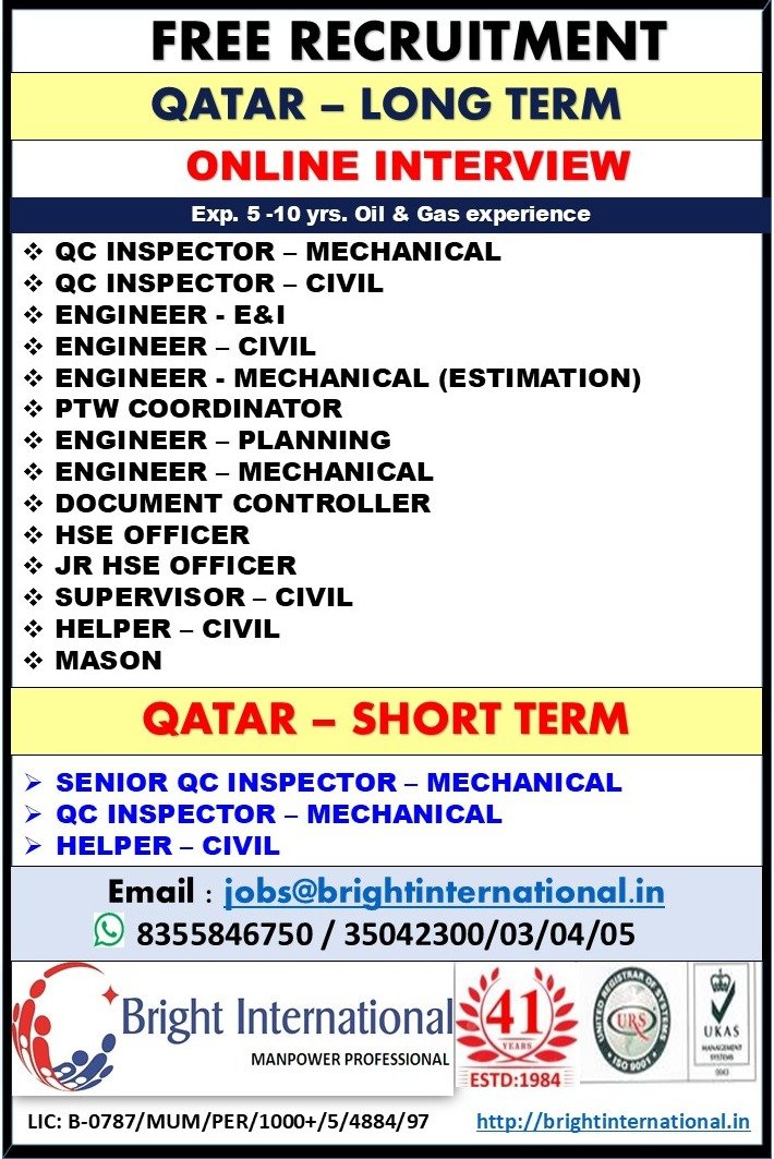 Bright International Manpower Professional (Est. 1984) is conducting free recruitment for reputed Oil & Gas projects in Qatar. Online Interviews in progress for both long-term and short-term positions.