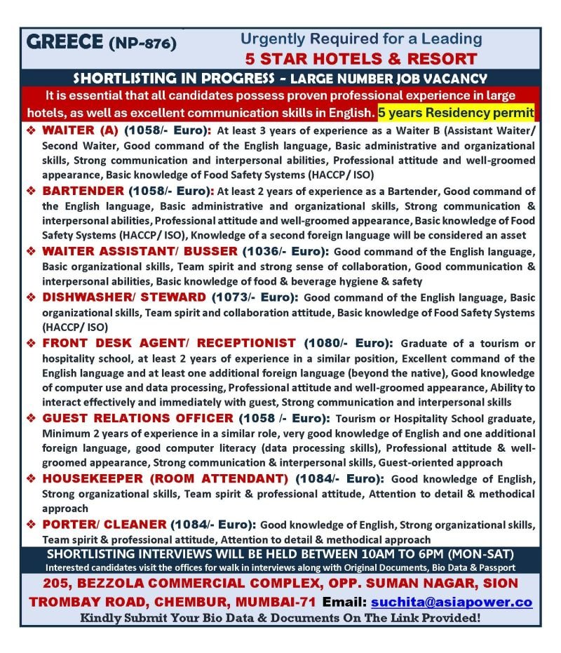 Greece : Hiring For 5 Star Hotel & Resort