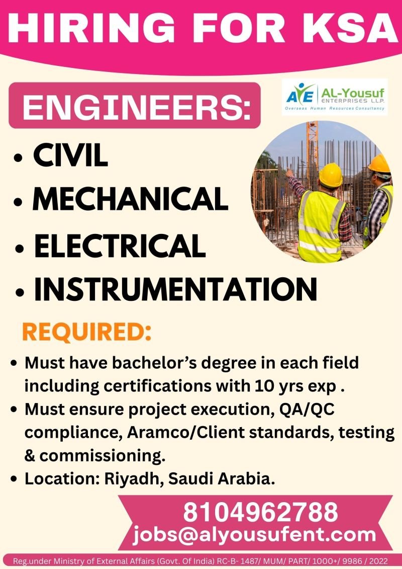 We are looking for experienced Engineers to join our client’s prestigious project in Riyadh, Saudi Arabia.