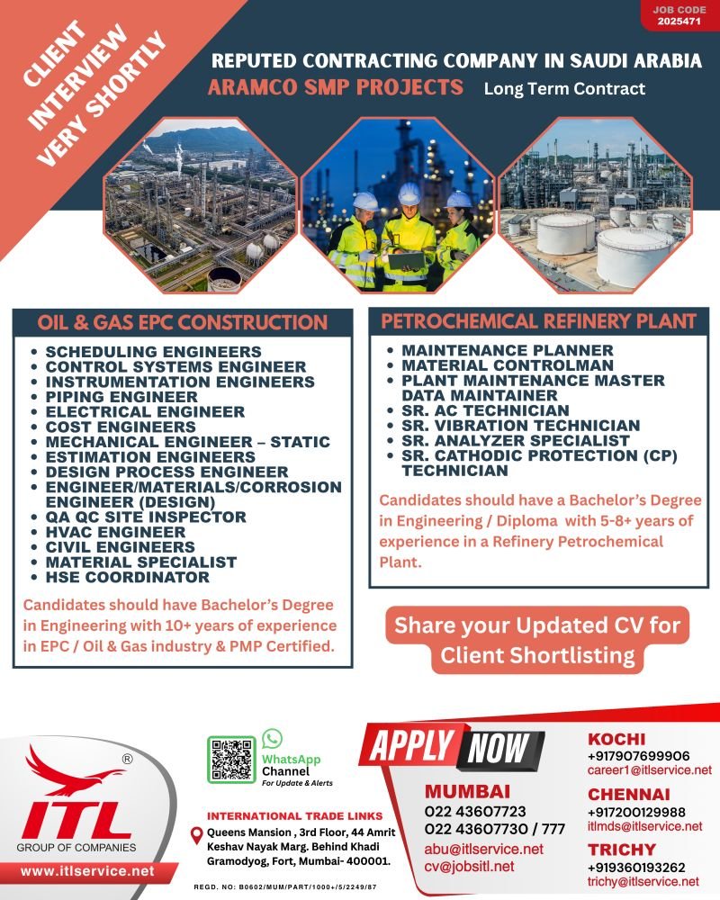 Hiring For ARAMCO SMP Project in Saudi Arabia