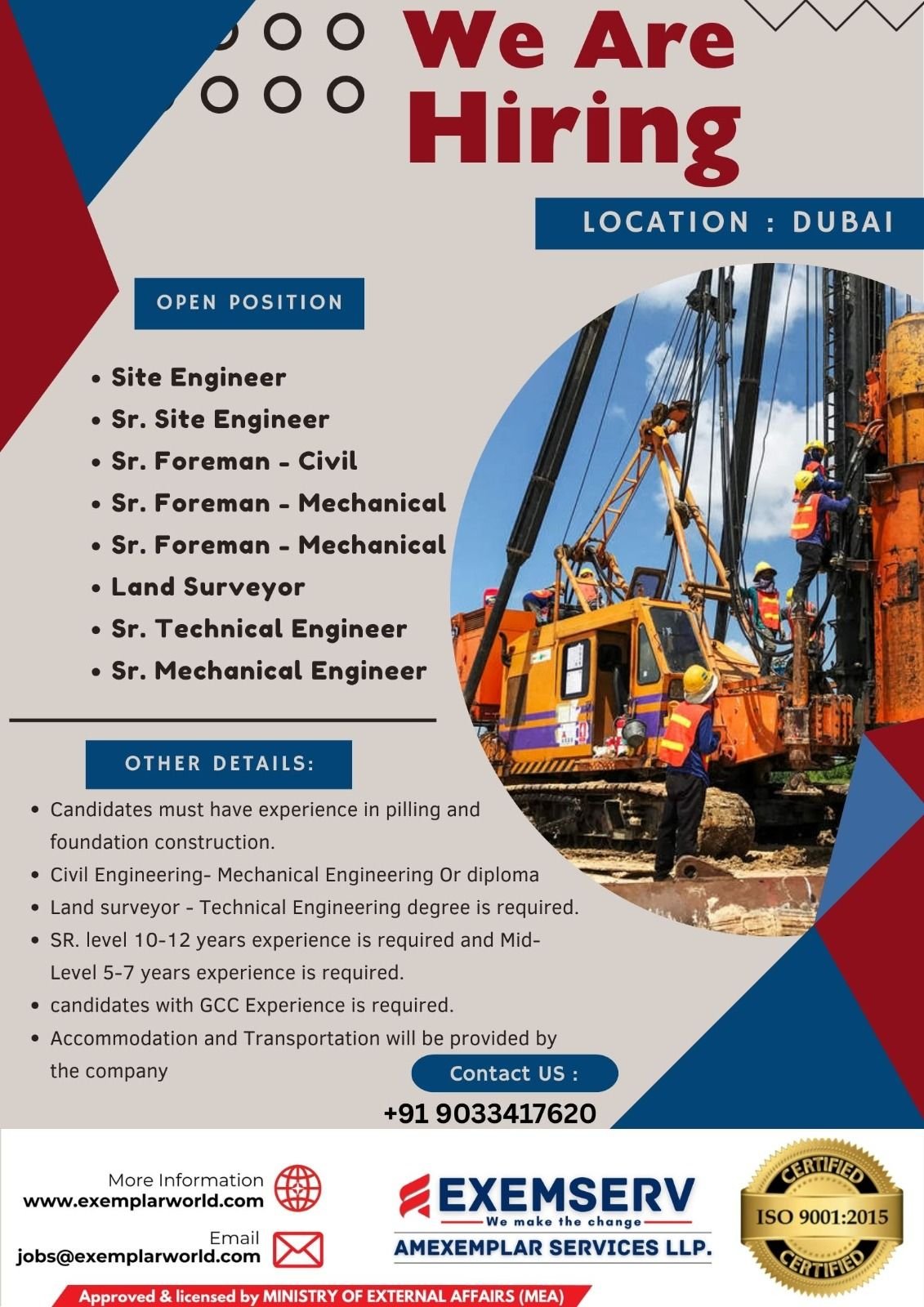 A leading Dubai-based construction company specializing in piling, deep foundation, and marine works is urgently hiring senior and mid-level professionals for ongoing and upcoming high-rise and infrastructure projects in Dubai & Northern Emirates.