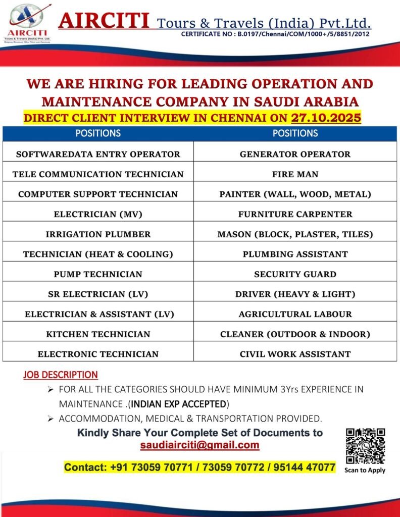 Airciti Tours & Travels (India) Pvt. Ltd. is conducting a direct client interview on 27th October 2025 in Chennai for a leading operation and maintenance company in Saudi Arabia. Apply now for exciting career opportunities with accommodation, medical, and transportation provided!