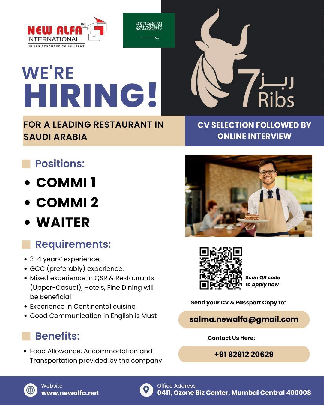 Hiring For Leading restaurant in Saudi Arabia – 7 Ribs!